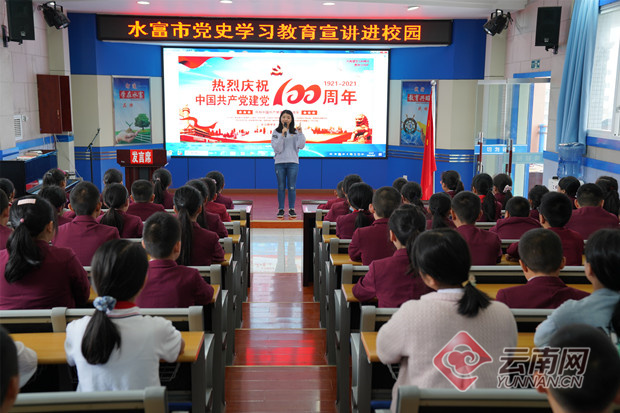 近日,水富市党史学习教育新时代文明实践中心志愿服务宣讲团走进水富市第一小学进行宣讲,为同学们送上一堂丰富生动的党史教育课,让红色基因厚植于青少年心中。宣传讲会上,宣讲团成员分别以“讲党史 悟思想—永远跟党走”为主题,为五年级和六年级学生作了《学英雄保家卫国》《伟大抗疫展现国力》等为内容的宣讲报告,讲述了水富策反起义的女英雄白宗华的故事以及中国从极贫极弱一穷二白到科技强国、经济发展强国和伟大抗疫精神等;水富市第一小学教师为学生们讲解了党旗、党徽的来历和意义,两名学生分别以《我心中的党旗》《我心中的党徽》作演讲。内容丰富的宣讲报告以生动鲜活的红色故事和党史案例为引,让学生知党史、敬党史、爱党史,拥护中国共产党,从小树立远大理想,长大成为对社会和国家有用的人才。生动感人的伟大抗疫精神,以及英勇顽强、舍生忘死的保家卫国精神,引起了大家的共鸣、赢得了学生们的阵阵掌声。