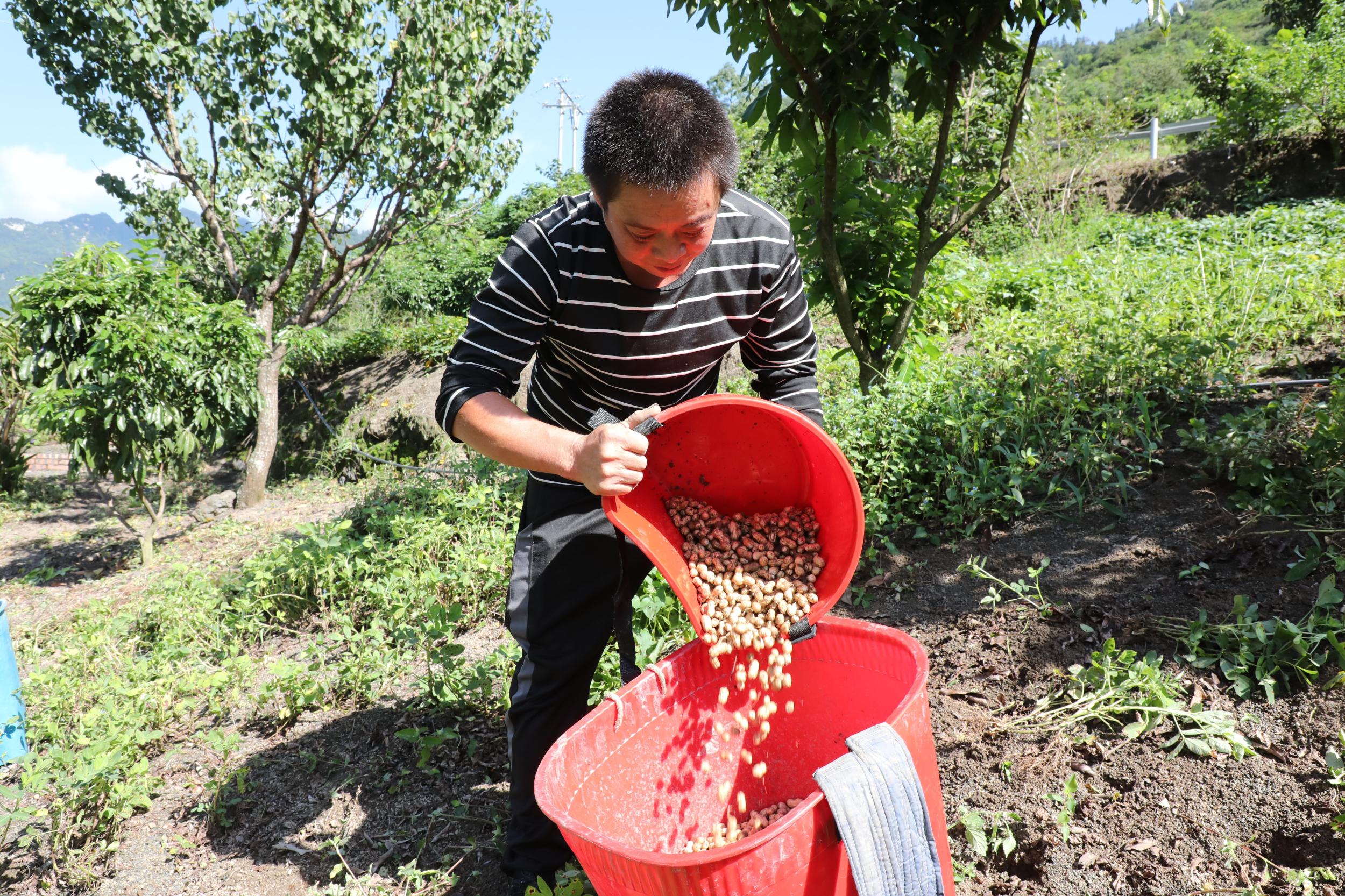 村民张友兵种有6亩桂圆。因为桂圆没到盛产期,为发挥土地效益最大化,他决定在果园内套种花生增加收入。“今年气候比较好,各方面管理也很好,花生结荚多、籽粒饱,品质和产量都很好。刚出土的花生价格能卖到每公斤20元,预计能卖15000多元。”看着自家屋里堆成的小山,张友兵脸上乐开了花,那笑容比这花生还饱满。