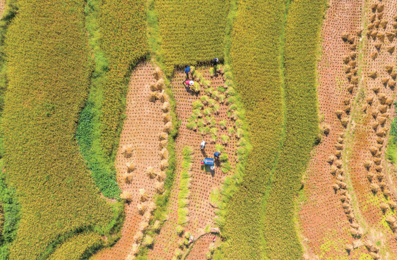 近日,在绥江县中城镇回望村夫人坝,数百亩高山梯田水稻渐次成熟。层层梯田尽染金黄,当地村民正抢抓晴好天气,忙着收割水稻。