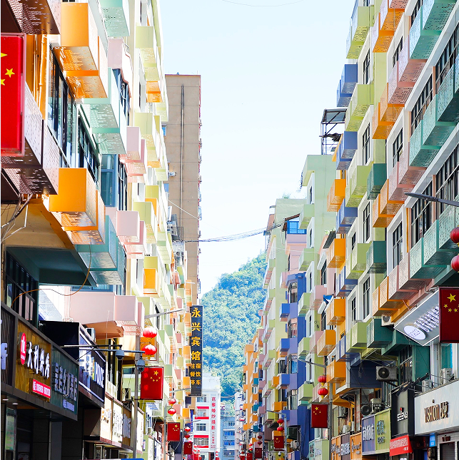 在老城区,盐津县坚持“微改造、精提升”,以“城市双修”为抓手,全面推进老旧小区改造、外立面整治和“飞线”治理。截至目前,已完成县大街337栋建筑外立面改造,整改广告门头3900平方米,整治空中管线800余处,彻底扭转“脏乱差”旧貌,重塑城市肌理。同时,有机融入吊脚楼、盐运文化等地方特色元素,改变城市单一色彩,打造“多彩盐津”城市品牌,塑造独具辨识度的“网红城市记忆标签”。