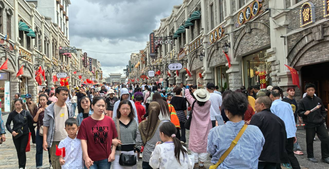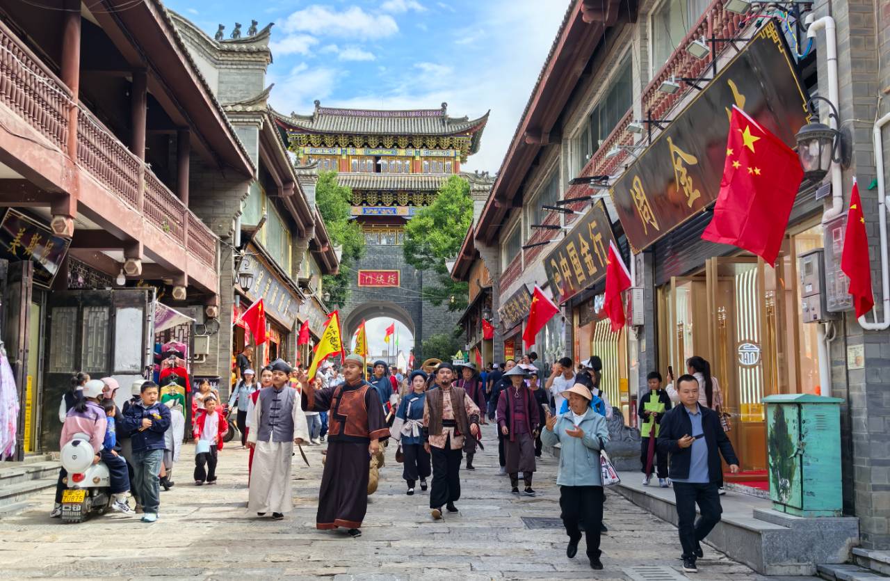 国庆假期,昭通古城被一面面鲜艳的五星红旗装点得暖意融融,“中国红”与青砖黛瓦相映成趣。随着《遇见昭通之古城风云》沉浸式巡游的马蹄声在抚镇门响起,这座融合清代建筑与法式风情的古城在假期首日就迎来客流高峰。
