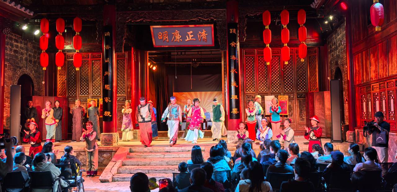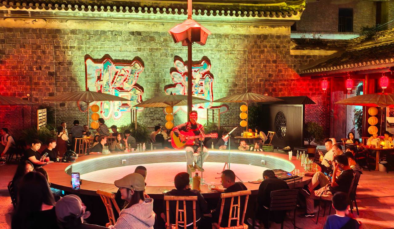 夜色中,昭通古城李氏支祠座无虚席,庭院花灯剧《柯四先生》精彩上演。当婉转的花灯唱腔响起,扮演柯四的演员李磊以风趣幽默的演绎,将这位昭通“民间智者”戳破贪官、惩治豪强的故事娓娓道来,成为不少游客的“昭通古城记忆”。值得一提的是,古城内几家特色酒吧也早早迎来客流,李氏支祠内木质吧台前坐满了歇脚的游客,驻唱歌手弹唱着民谣,酒杯碰撞声与轻声交谈声交织,为古城增添了几分现代休闲气息。