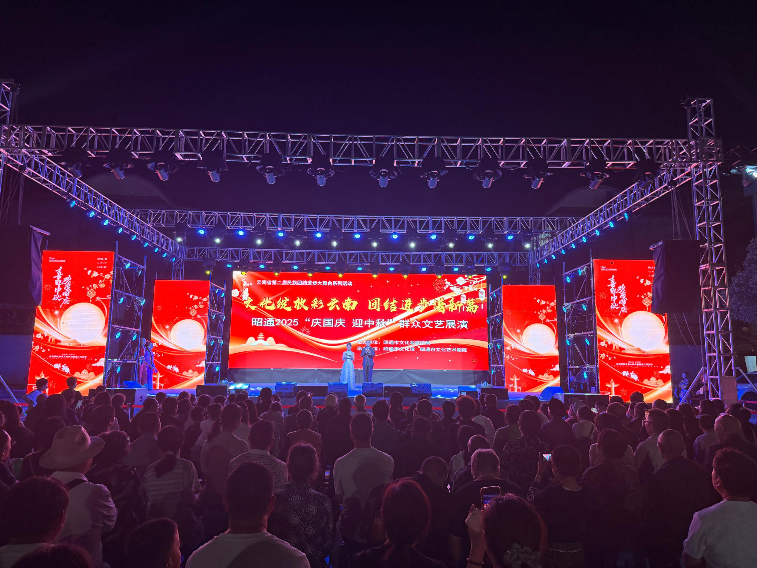 10月6日晚,昭通古城箭道广场灯火璀璨、人声鼎沸,“文化绽放彩云南·团结进步谱新篇——昭通市2025‘庆国庆 迎中秋’群众文艺展演”在此倾情上演,一场视听盛宴在皎洁月光与人间烟火的交融中拉开帷幕。