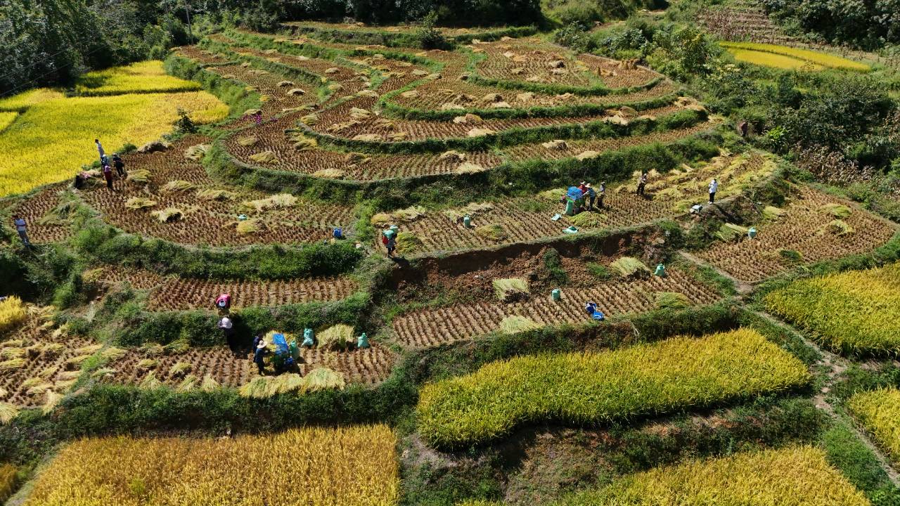 原标题:大关:金秋稻浪涌 农户收割忙