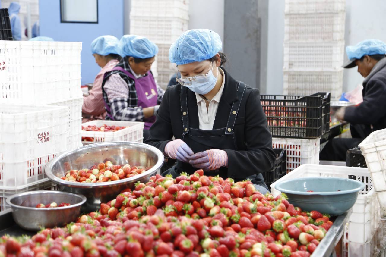 在巧家万瑞食品有限公司的加工车间内,工人们正在对草莓进行清洗、去蒂、速冻等工序,制作成冻干草莓产品。这条上海援建的冻干草莓生产线,年加工草莓 3000 吨,产品远销中东、欧洲;与嘉信食品合作的果脯项目,年销售额预计达6000万元。