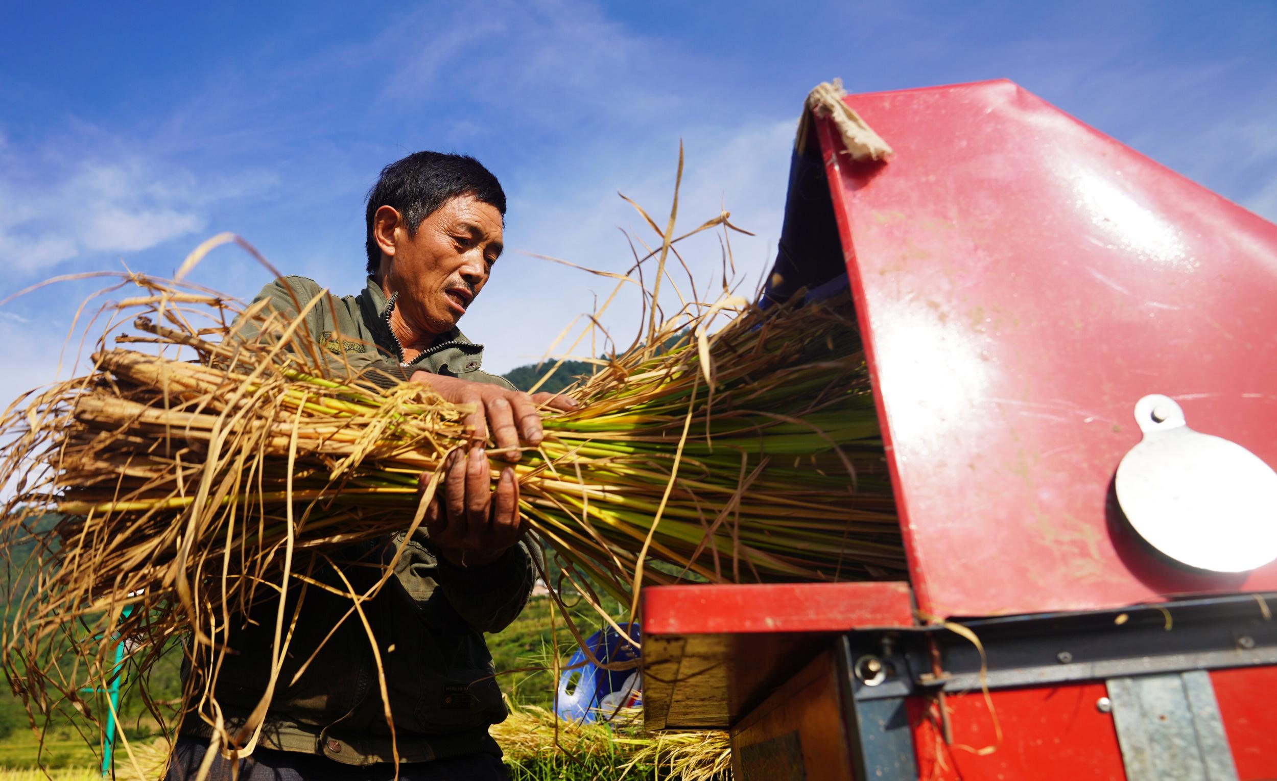 在离县城不远的角奎街道马窑村,稻谷种植户刘明兵也开始了收割工作,村“两委”干部和驻村工作队员也加入其中,割稻、脱粒、装袋、运输,大家分工协作,干劲十足。“我家今年种了3亩稻谷,亩产量在750公斤左右。”刘明兵说。