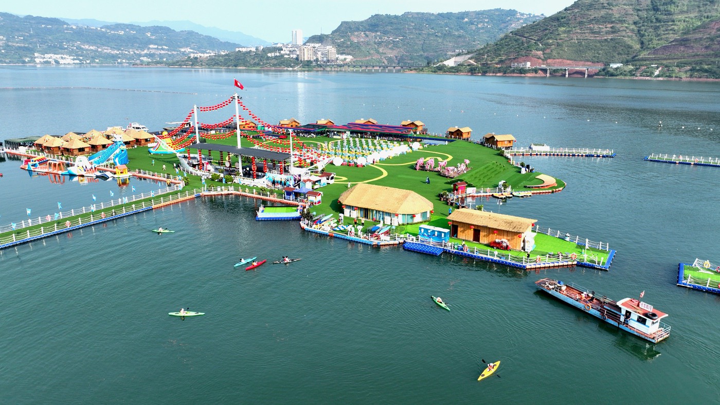 走进昭通绥江金沙水上乐园,金沙江碧波旁,浮筒拼接的水上漂浮岛像镶嵌在江面上的宝石,摩托艇轰鸣疾驰掀起层层浪花,岸边沙滩乐园里,孩子们光着脚丫堆沙堡、追泡泡,休闲公园内市民伴着微风散步赏景,欢声笑语与设施声响交织,满满活力扑面而来。