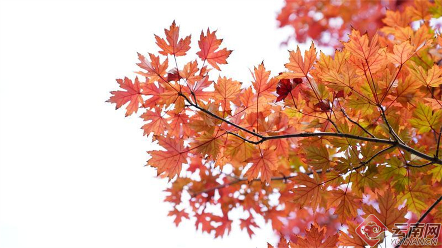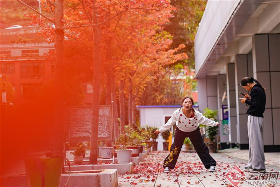 初冬时节,昭通市彝良县体育馆周边枫叶红似火,或深或浅交织在一起,构成了一幅独特而迷人的景致。片片枫叶从树梢落下,脚下满地金黄,吸引了市民打卡拍照。