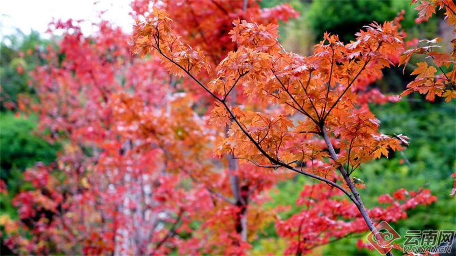 彝良县体育馆周边枫叶红似火。