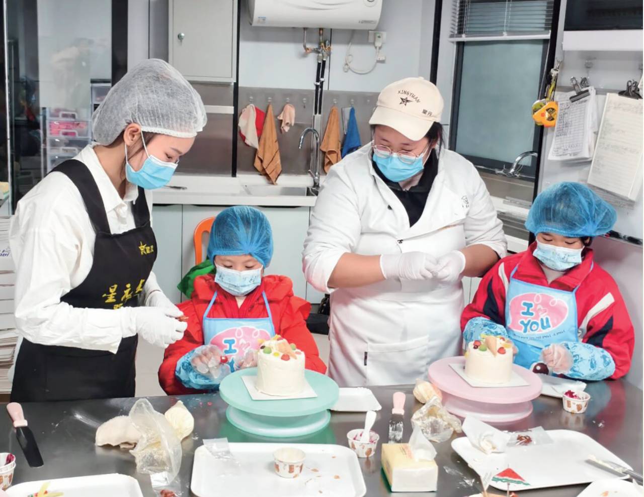 蛋糕制作课堂上,孩子们系上小围裙、戴上一次性手套,化身“小小烘焙师”,在社工和专业店员的耐心指导下开启创作。从为蛋糕坯均匀涂抹果酱,到小心翼翼叠放坯层,再到用抹刀修整奶油边缘、用水果和糖珠点缀装饰,每一个步骤都饱含孩子们的专注与创意。“抹奶油要均匀,装饰可以按照自己喜欢的样子搭配。”党员志愿者在旁耐心提醒,手把手指导动作还不熟练的孩子。当一个个造型独特、色彩鲜艳的蛋糕新鲜出炉时,孩子们迫不及待地与同伴分享自己的成果,教室里充满欢声笑语,甜蜜的味道与幸福的氛围在空气中弥漫。