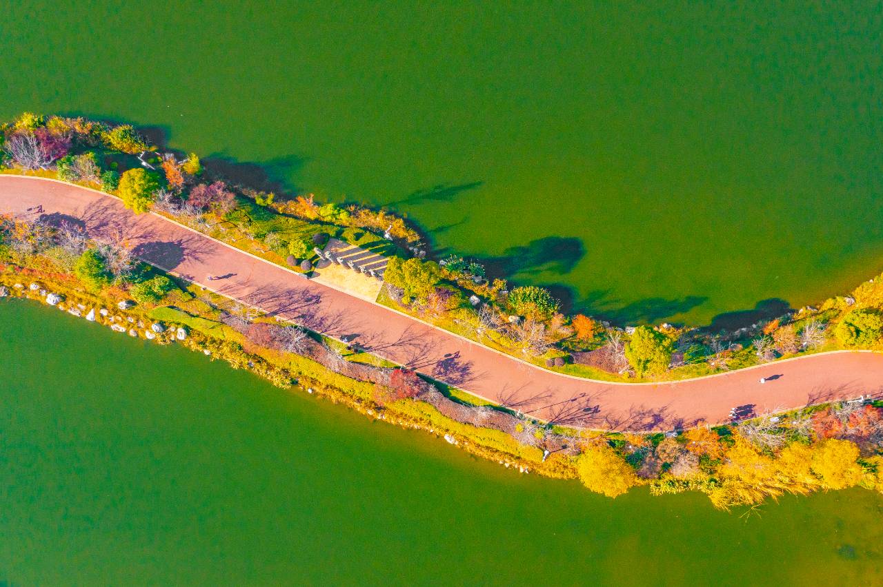 冬日的阳光格外温柔,透过疏密相间的枝叶洒下斑驳的光影,为环湖步道增添了一层梦幻的滤镜。沿着蜿蜒的步道前行,脚下偶尔传来落叶窸窣的轻响,与远处湖面的粼粼波光交织成韵。微风拂过,枝头的彩叶随风摇曳,姿态潇洒飘逸,宛如千万只彩蝶翩翩起舞,又似层层浪花在公园中翻涌,尽显自然野趣。成片的银杏叶悄然飘落,在步道上铺成了一张柔软的金色地毯,行人踩上去沙沙作响。这里已成为公园内最受欢迎的打卡点之一,不少市民带着家人、约上好友,在此拍照留念,把欢声笑语留在冬日的晴空下。