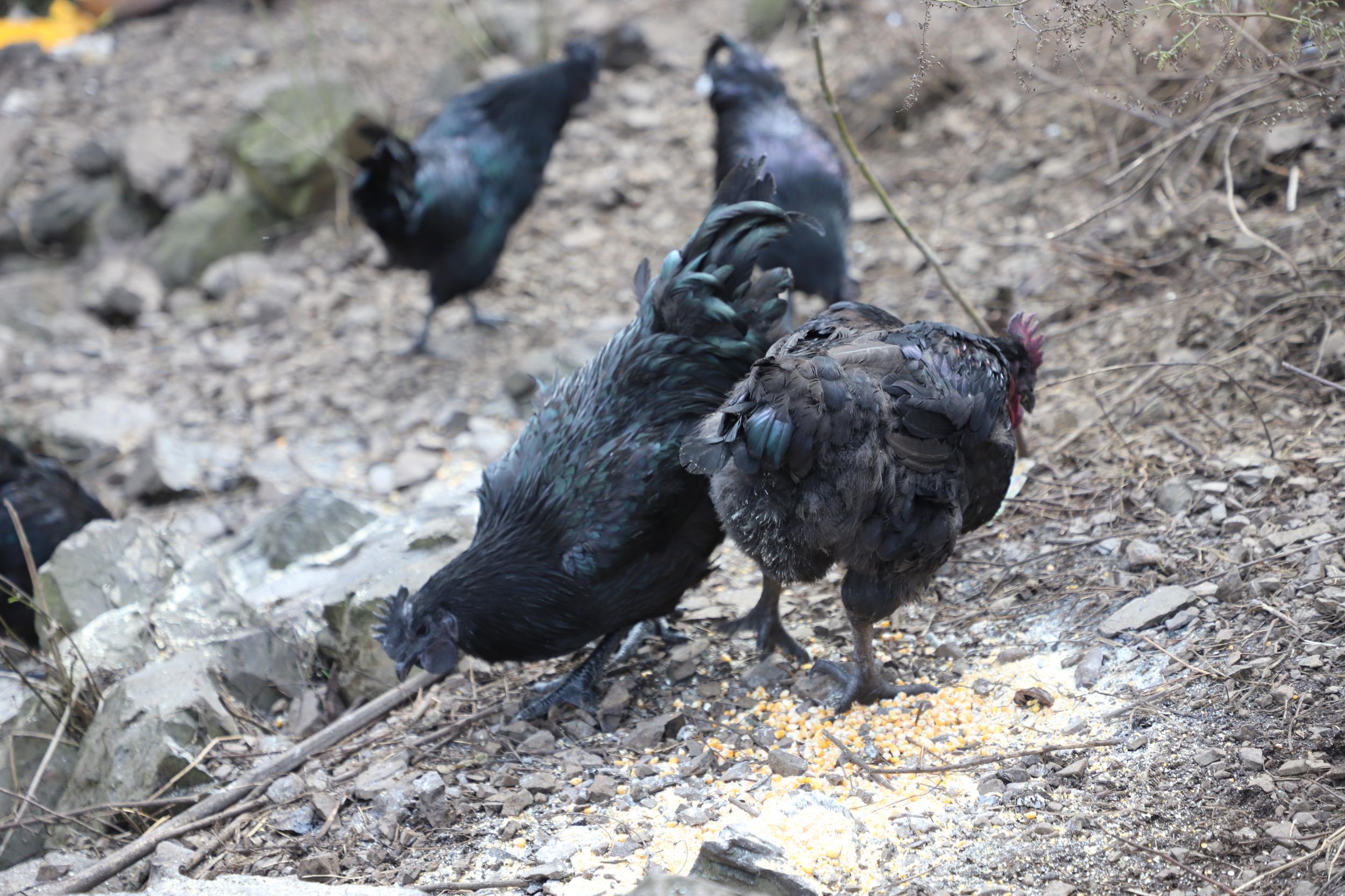 在周兴彬的生态养殖基地,一群乌黑油亮的乌骨鸡正在山地里自由活动、觅食。周兴彬背着刚加工好的新鲜玉米面行走在坡地间,一边吆喝唤鸡,一边投喂,成群结队的乌骨鸡应声而来,跟随着他的脚步移动,基地里一派生机勃勃的景象。