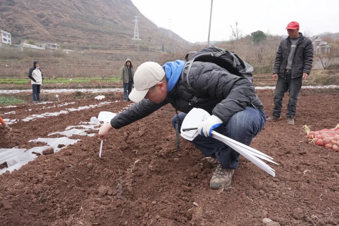 董宇一行深入赵家海村田间地头,指导群众将其自带的多个马铃薯新品种进行试种。这些品种具有抗病性强、适应性广、产量高等特点,适应高海拔山区气候与土壤条件。