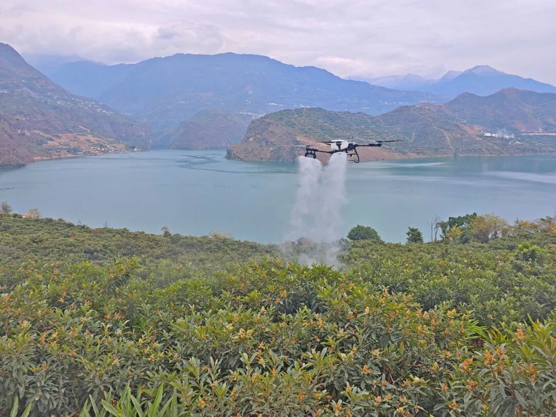 培训现场还开展了无人机飞防演示,工作人员操作无人机在枇杷园上空平稳飞行,均匀喷洒水雾,直观展示其在病虫害防治、果实吊运等场景的应用优势,增强群众科技兴农意识。