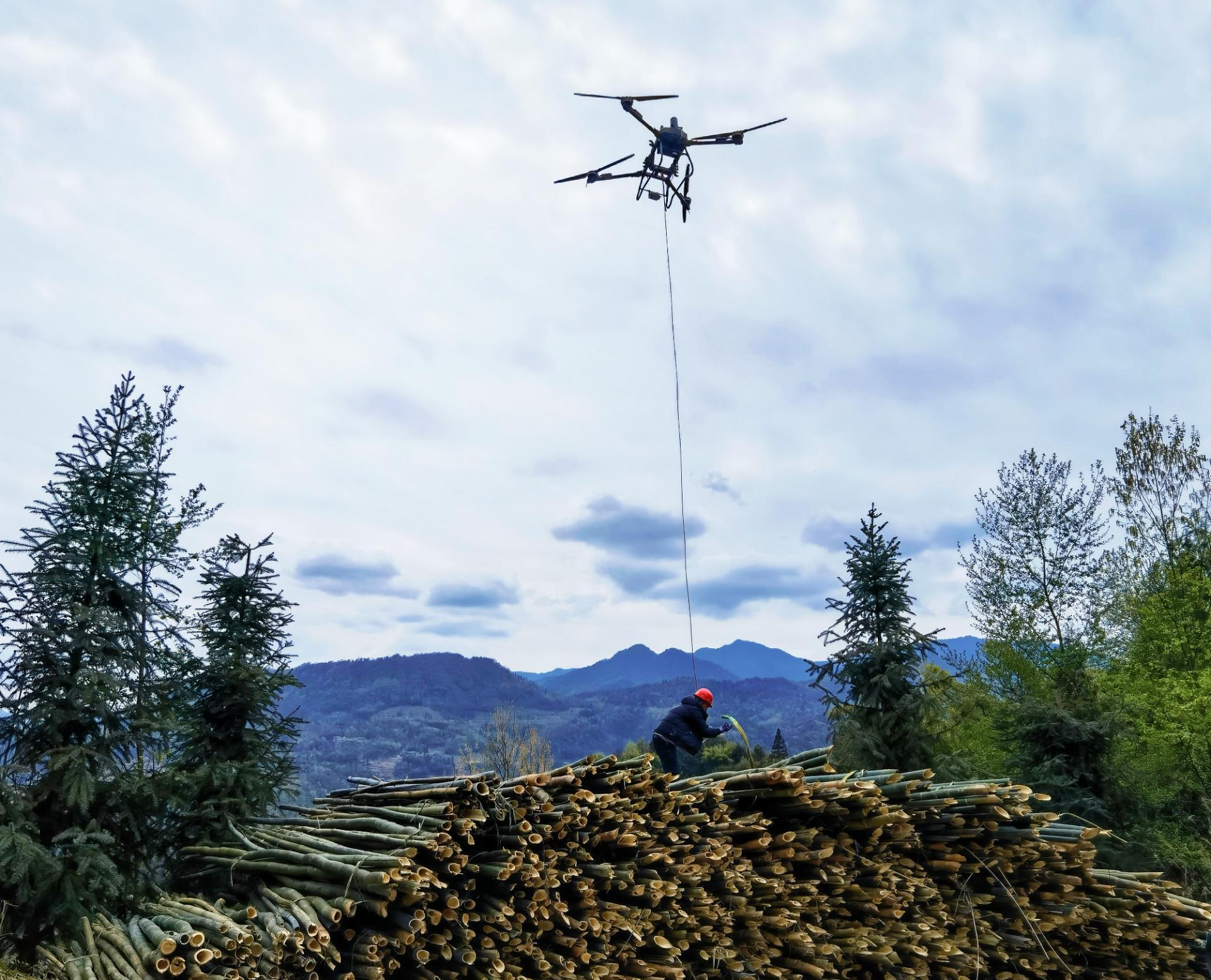 “无人机吊运可节约人工成本70%以上,工作效率相当于传统人力搬运的20余倍。”操作员兰红平介绍,无人机具备悬停、垂直起降能力,不受复杂地形限制,在山区间飞行灵活。单次最大吊运重量可达80公斤,一架无人机一天就能完成10余吨竹材的转运任务。