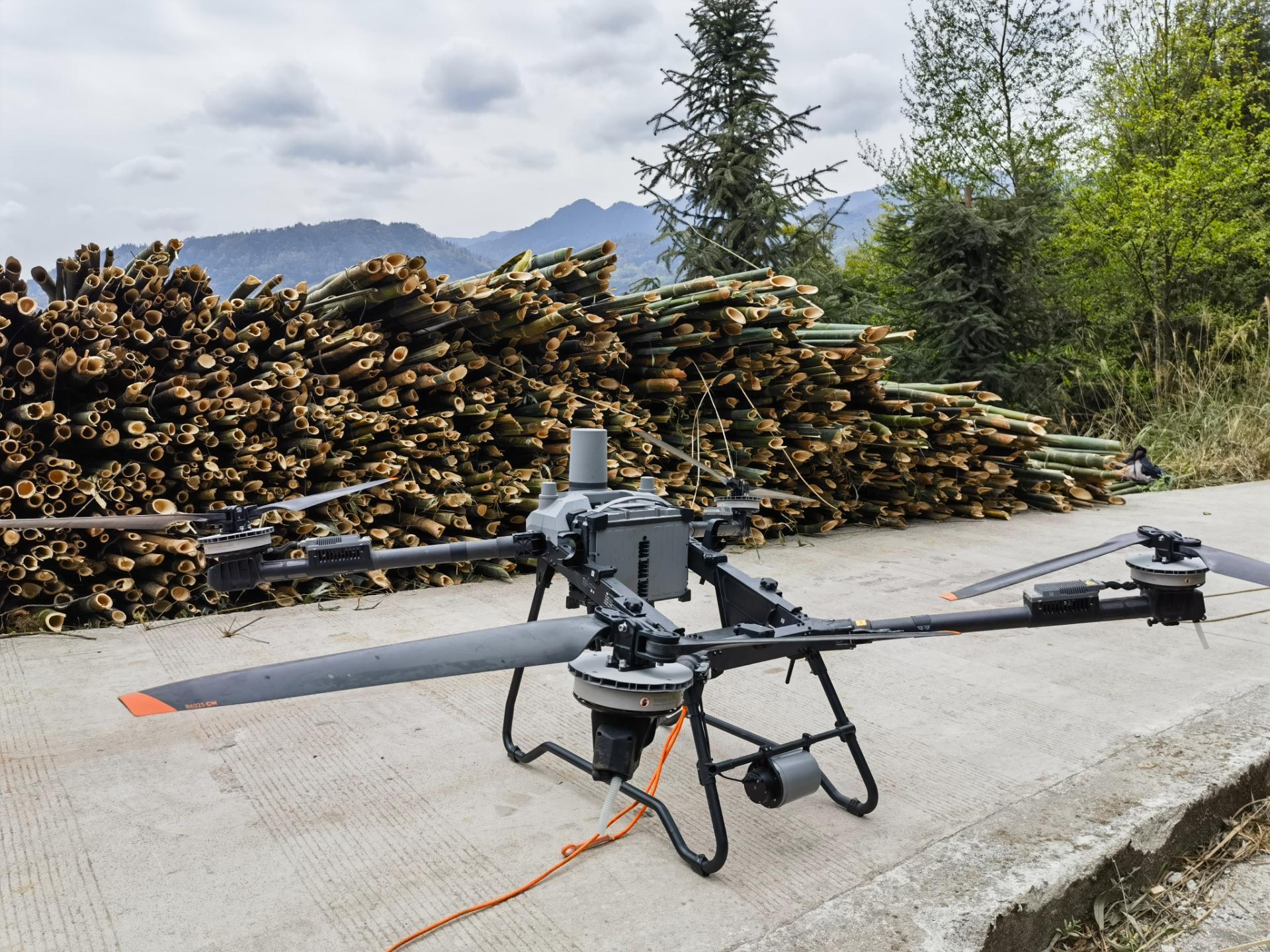 清晨,回望村的慈竹砍伐点已是一派忙碌景象。村民将砍伐好的慈竹整齐挂载至无人机的专用吊索。在操作员的精准操控下,负载着数十公斤竹材的无人机平稳升空,沿着预设航线飞越山谷沟壑,仅用约1分钟便安全抵达公路旁的堆放点,完成了过去需要数人耗时费力才能完成的运输任务。