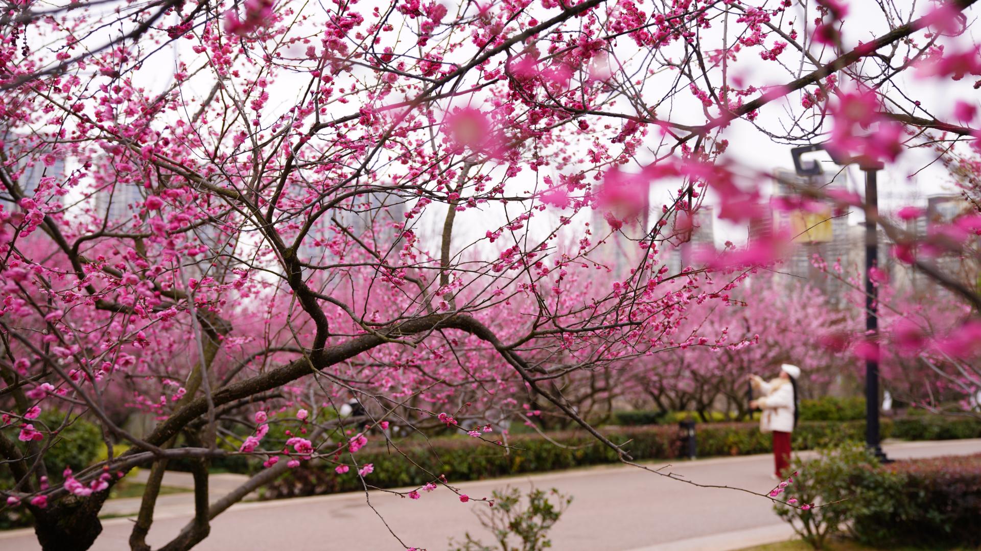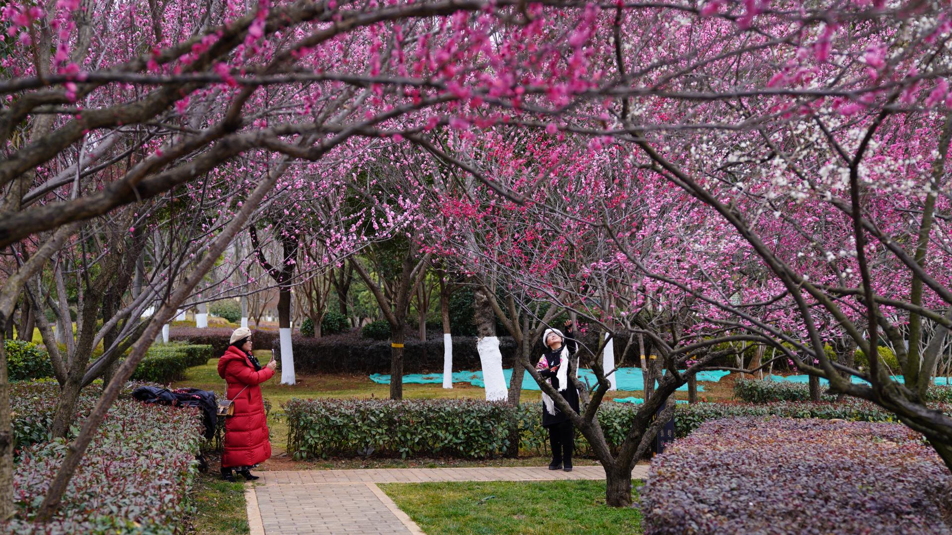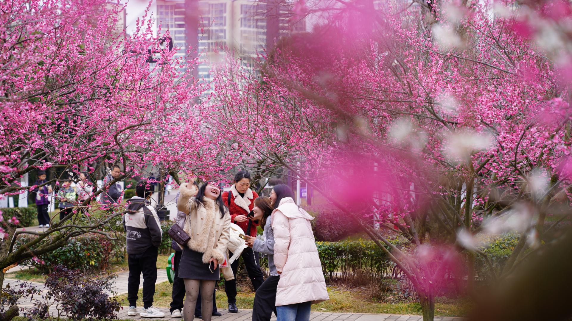 近日,昭通省耕国学文化公园的梅花宛如点点繁星在初春的寒意中傲然绽放,红的似火、粉的如霞、白的像雪,各自展现着独特的韵味,引得游客纷纷驻足观赏,沉醉在这迷人的春日美景之中。图为,游客在昭通省耕国学文化公园内赏梅,拍照留影。(彭洪)
