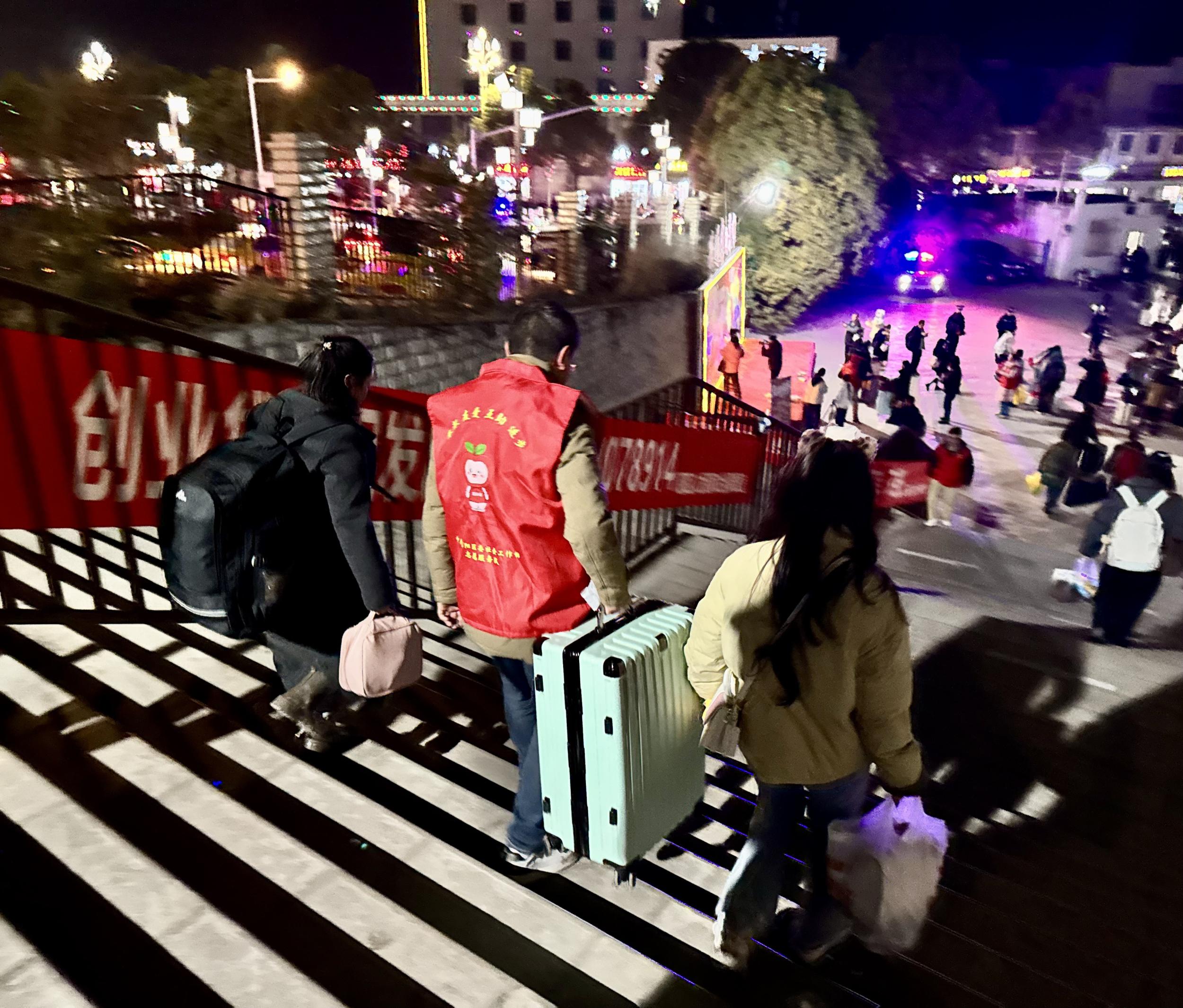 为做好乘火车夜间抵昭务工人员服务保障,昭阳区人社局牵头联合公安、交运、共青团、妇联、工会等多部门,在昭通火车站设立临时休闲驿站,免费提供热饮、简餐、饮用水等服务。组织工作人员与志愿者开展行李搬运、老弱帮扶、客流疏导等工作,统筹调配20辆免费直通车规划专属路线,实现出站即接驳、返乡更顺畅。