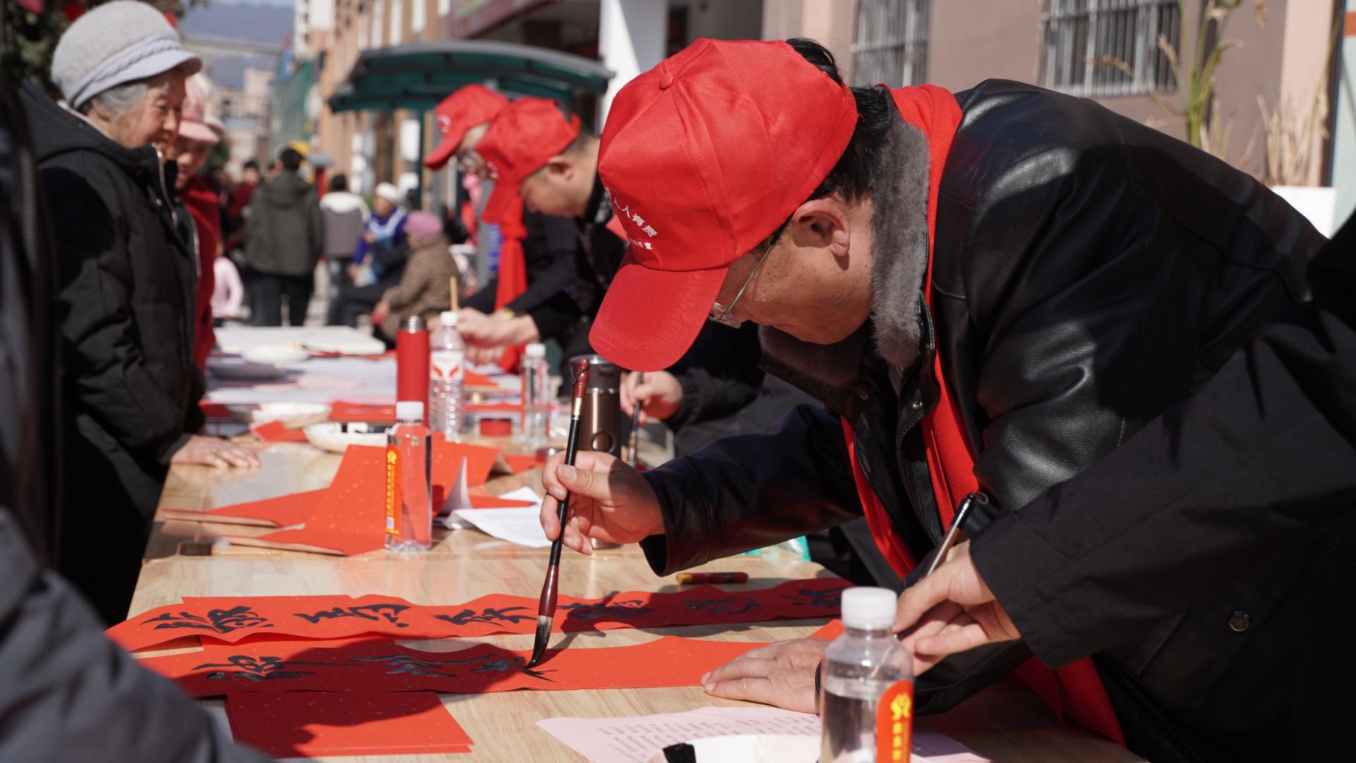 除了精彩的文艺演出,现场设置的多个民俗体验与游园活动专区同样人气爆棚。在送春联、写“福”字专区,本地书法爱好者挥毫泼墨,笔锋游走间,一副副寓意吉祥的春联和一个个饱含祝福的“福”字跃然纸上,免费赠送给现场群众,传递着新春的温暖与祝福。做福扇活动吸引大人孩子积极参与,大家拿起画笔在扇面上精心绘制新春图案,留下独特的节日纪念。