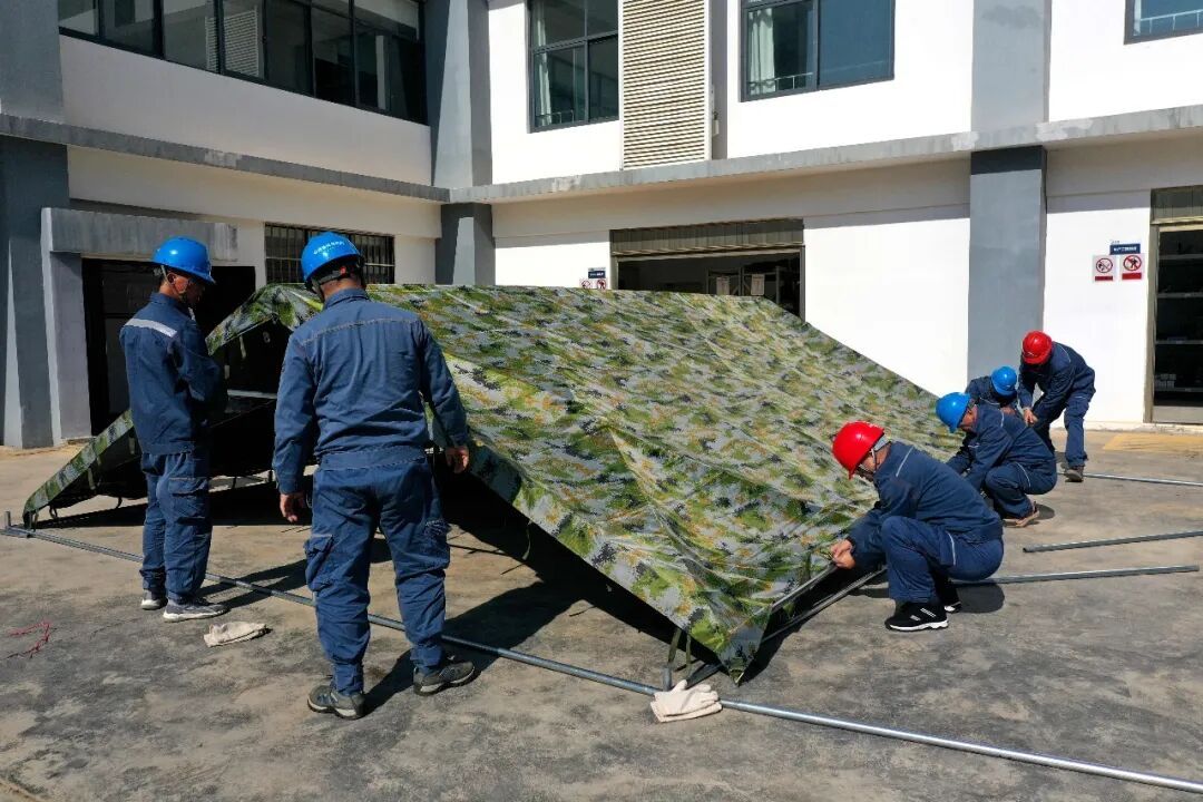 演练警报响起后,全体人员迅速响应,严格按照应急预案就近避险、有序撤离,在规定时间内完成安全集结。随后,应急队伍立即转入实战状态,高效搭建临时指挥部帐篷,快速点亮应急“第一盏灯”,各项处置流程衔接顺畅。