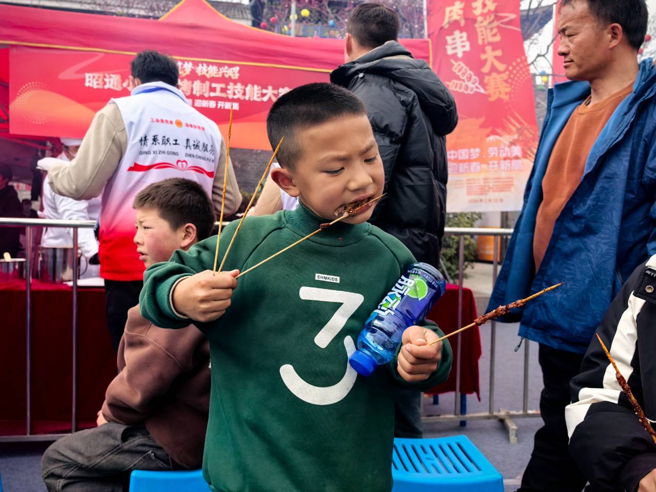钟琦穿梭在赛场与免费试吃区,看着热闹的场景,脸上露出了欣慰的笑容。“我们准备了14万串昭通小肉串现场免费发放,一直供不应求,市民和游客的反响非常热烈。”