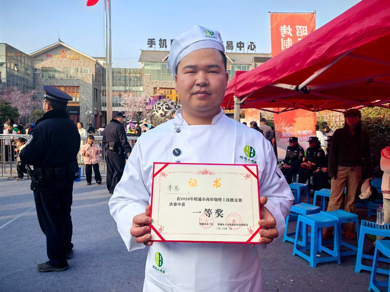 傍晚时分,竞赛进入白热化阶段。经过多轮比拼,60名选手中的佼佼者脱颖而出,最终评选出一等奖1名、二等奖3名、三等奖6名。当念到一等奖获得者李恩的名字时,现场响起了热烈的掌声。李恩手持荣誉证书,声音里带着抑制不住的激动:“感谢各级各部门为我们搭建这样好的平台,让我有机会展示自己的烤制技艺。通过这次比赛,我更有信心把昭通小肉串带出昭通、迈向全国!加油,昭通小肉串!”