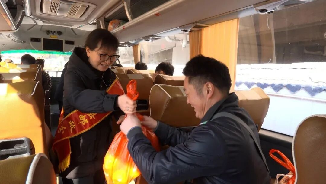 启动仪式上,工作人员为登车的务工人员代表发放了精心准备的“爱心礼包”,内含矿泉水、面包、方便面等物品,将党和政府的关怀与温暖送到每一位外出务工人员的心坎上。