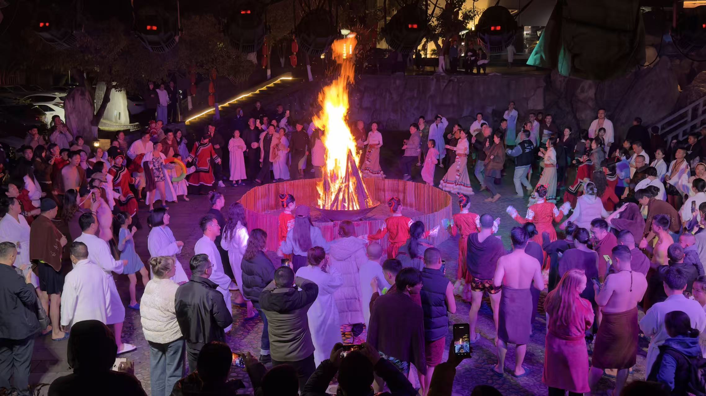 春节期间,景区每日轮番呈现不同非遗体验项目:街头云南民歌舞快闪吸引游客即兴参与,沙滩游园会上变脸吐火、皮影戏让小朋友目不转睛,夜晚篝火打跳与非遗市集更将烟火气拉满。“以前只在电视上看过打铁花,这次亲眼看到千度铁水抛洒成漫天星火,太震撼了!”来自四川自贡的游客张红玉连连赞叹“不虚此行”。