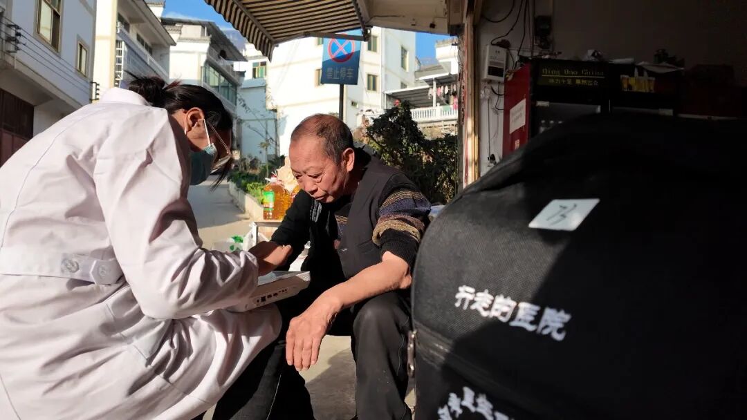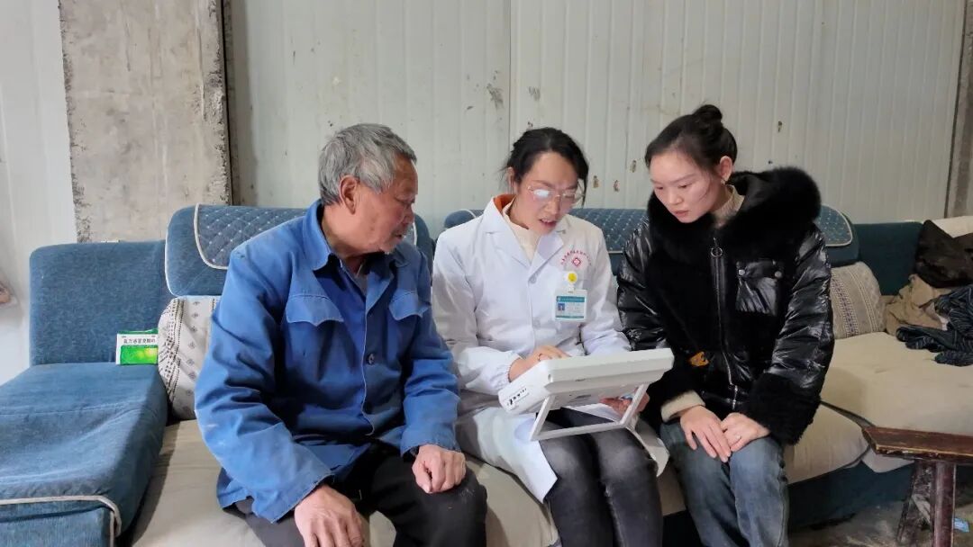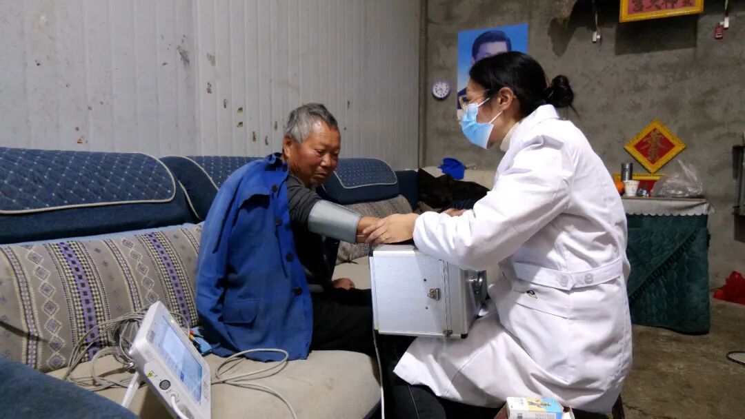 今年72岁的张明洋是易应梅当天走访的第一位患者,老人患有糖尿病等慢性病,以往检查都要去县里,自从“行走的医院”项目在村里实施以来,易应梅就成了他家的“常客”,不仅定期上门监测血压、血糖、心电图,及时调整用药,还通过全科医生助诊工作站为他建立电子健康档案。