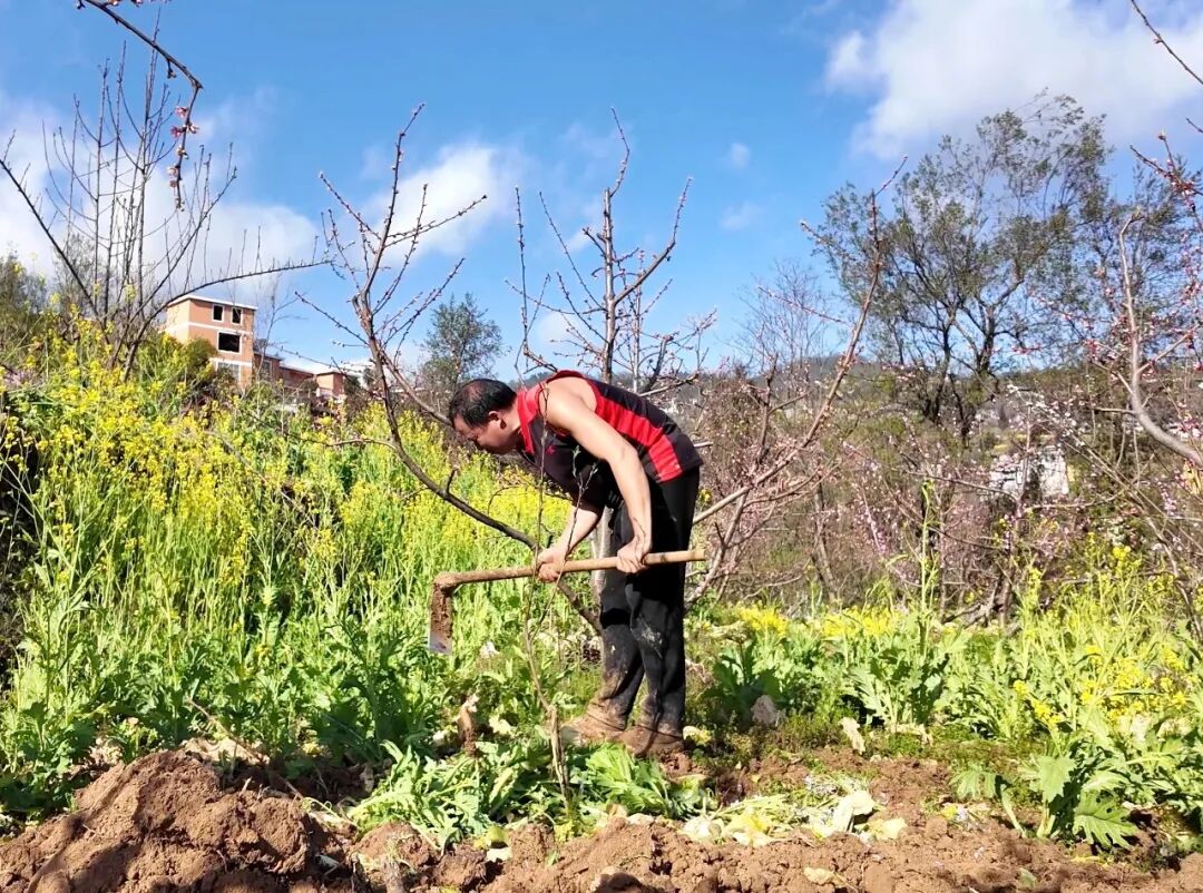 来到当地群众张朝友的桃园里,只见张朝友正手持锄头,娴熟地在桃树树冠外沿挖出一条环绕树冠的沟渠,随后就地取材,将田间杂草、枯枝、菜叶等就地掩埋,为果树增施天然有机肥。据张朝友介绍,他种植桃树已有10个年头,每年花期前后都会通过深埋枯枝、绿叶等方式管护果树,这样结出的桃子果型更大、口感更甜,口感极佳。