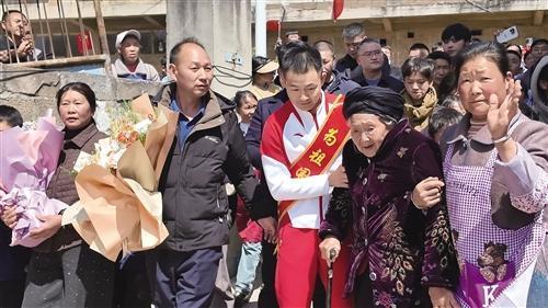 村口,印有“热烈欢迎冠军蔡佳云回家”字样的红色横幅迎风招展,成为春日里最温暖的风景。全村男女老少手持小红旗早早列队等候,翘首以盼心中的英雄归来。“欢迎佳云回家!”现场群众的欢呼声此起彼伏。质朴的呐喊声里,满是家乡人民最真挚的情感。