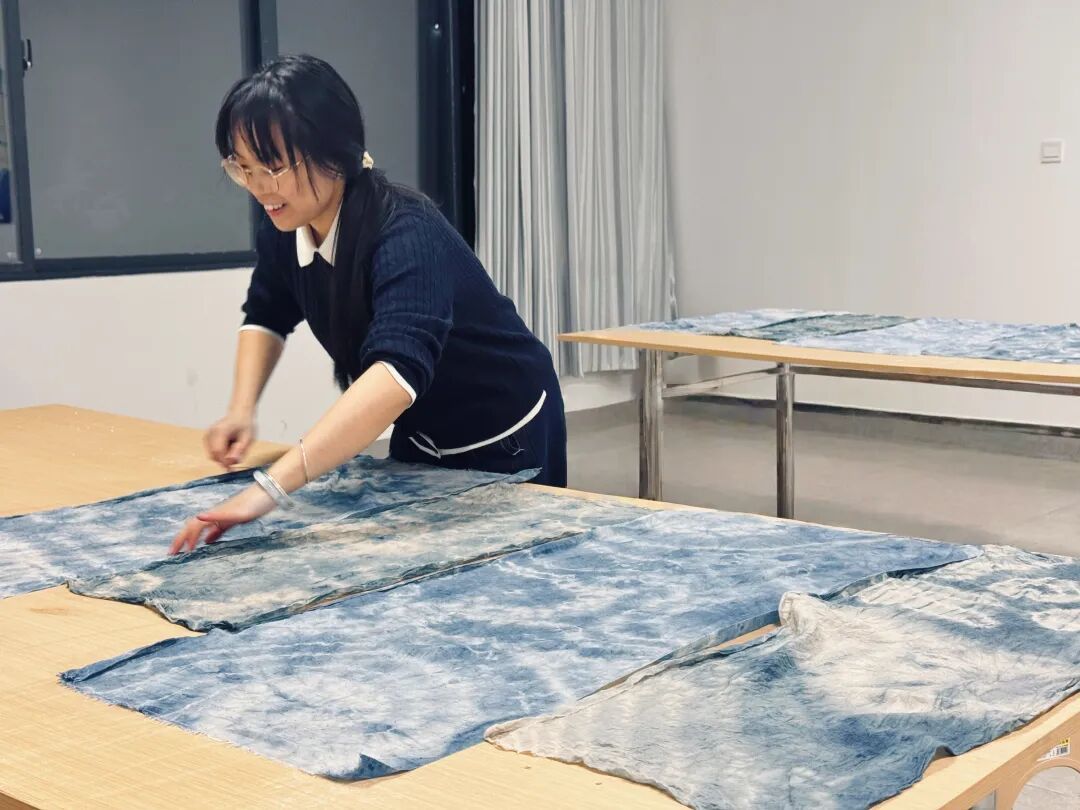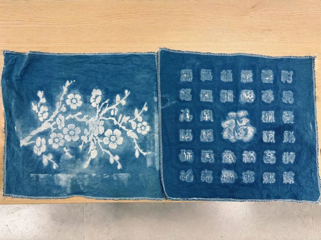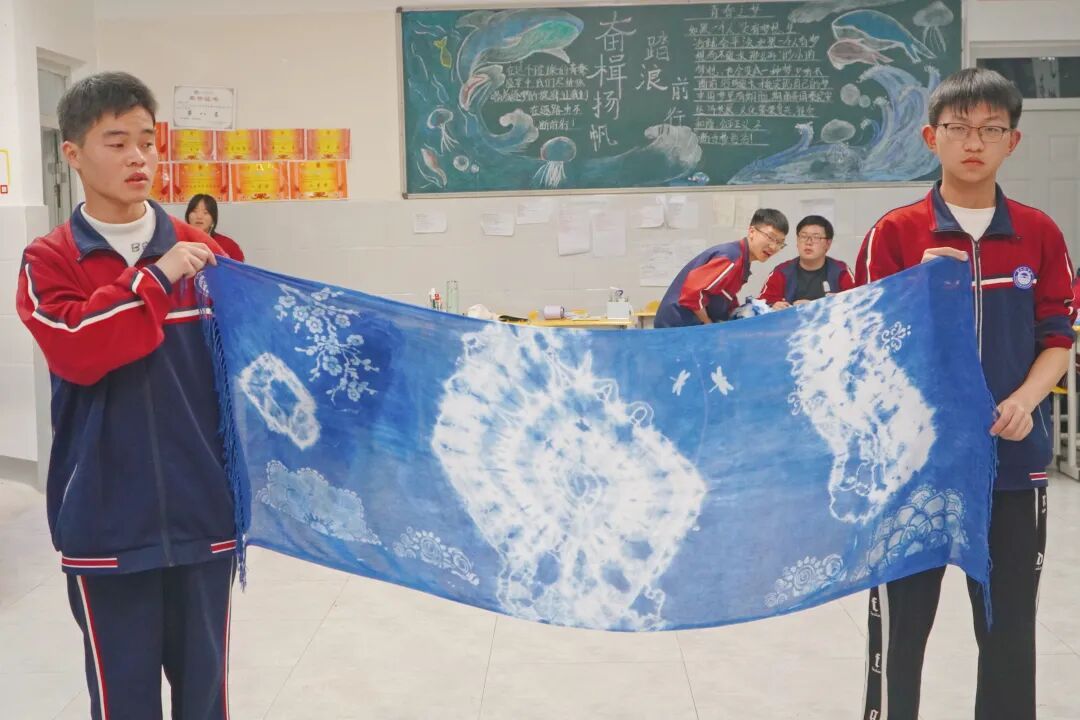 教室临时成了“染坊”。指导老师从怎么捆扎、怎么折叠,到如何浸染、如何拓染,一步一步教。扎染就是把布料捆扎起来再染色,捆住的地方染不上,解开后花纹自然随机;豆染则是用黄豆面调成糊,透过镂空花板刮印在布上,染完刮掉豆糊,留下整齐的图案。扎染区里,经过捆扎、浸染,布匹解开后蓝白相间、明黄温润;豆染区里,学生们小心地刮印豆糊,再放进染液,每块布上的花纹规规矩矩。每一件作品都散发着春天草木的气息。