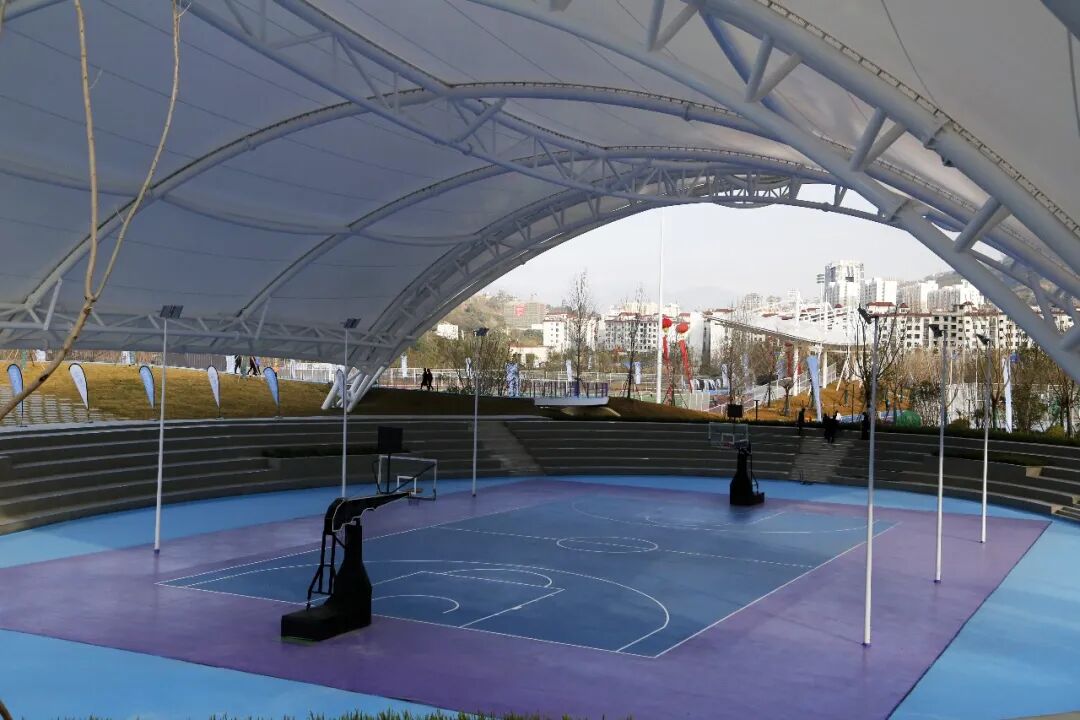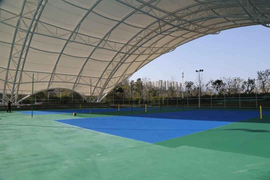 继续深入,园区功能布局的合理性愈发凸显。围绕足球场周边,篮球场、网球场错落排布,各场地间距合理、动线清晰,其设计细节尽显人性化与专业性。篮球场、网球场建设亮点十足,采用张拉膜结构顶棚搭配专属排水系统打造。简约大气的张拉膜顶棚质感轻盈,既能有效抵御风雨侵袭、遮挡烈日暴晒,又凭借良好的透光性保障场地光线充足,彻底打破天气对赛事的桎梏;配套的高效排水系统则能快速疏导场地积水,双重保障让赛事无惧风雨,实现全天候、高质量举办。